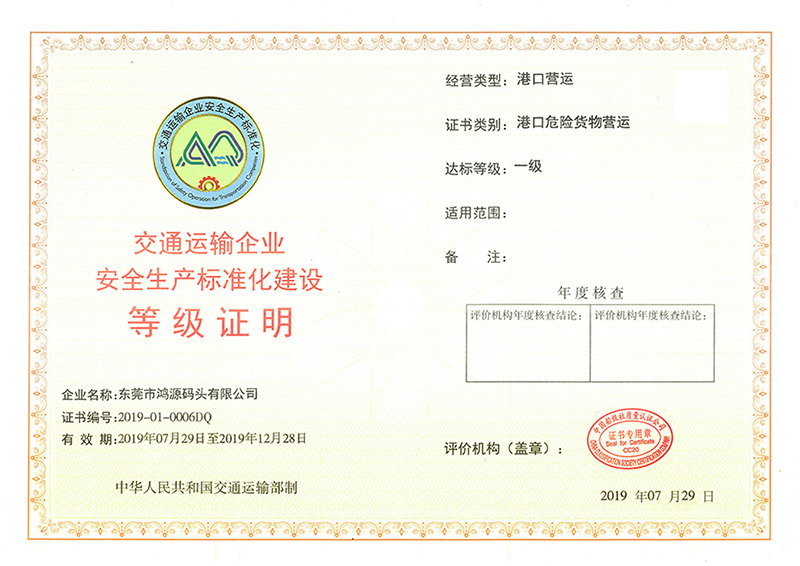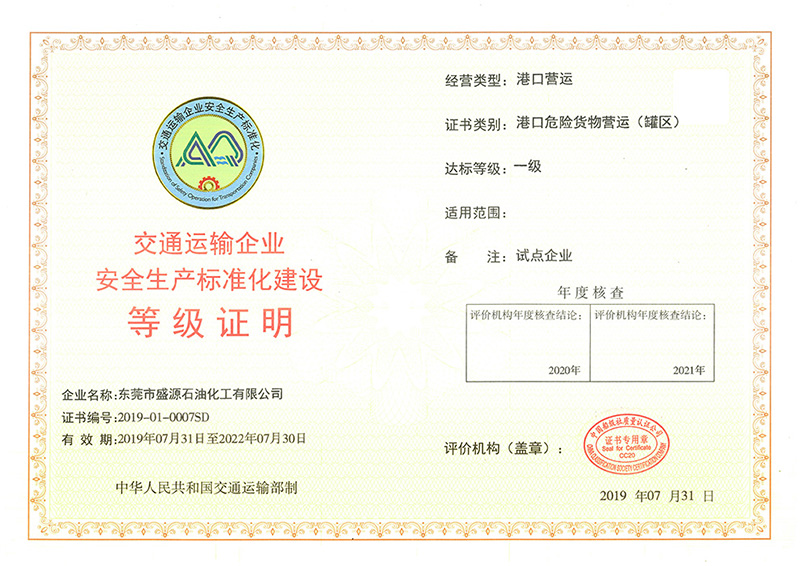 日前,巨正源所屬盛源石化、鴻源碼頭正式獲得由國家交通運(yùn)輸部頒發(fā)的“交通運(yùn)輸企業(yè)安全生產(chǎn)標(biāo)準(zhǔn)化建設(shè)一級(jí)達(dá)標(biāo)企業(yè)證書”,這標(biāo)志著盛源石化、鴻源碼頭安全生產(chǎn)管理邁上標(biāo)準(zhǔn)化、規(guī)范化的新臺(tái)階。
