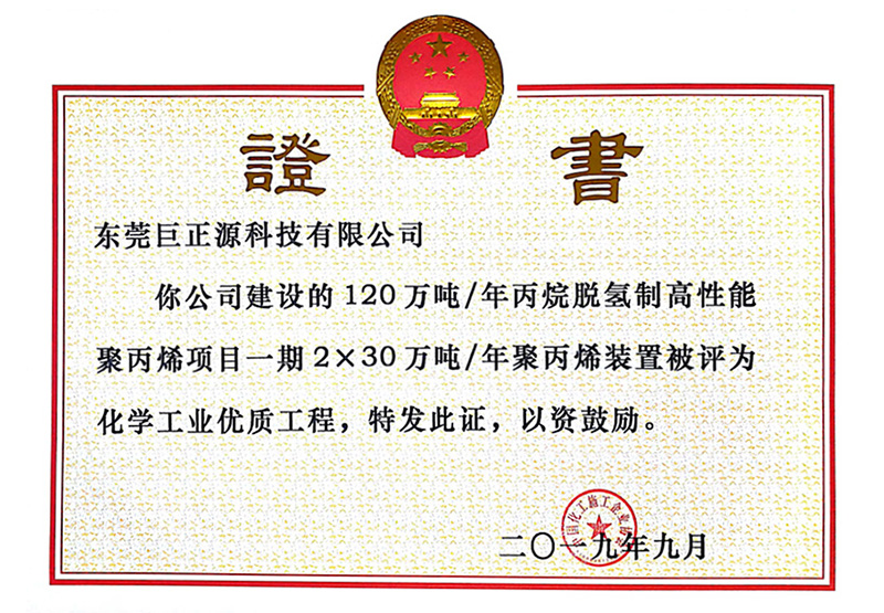 近日,中國化工施工企業(yè)協(xié)會公布全面提升工程質(zhì)量創(chuàng)建優(yōu)質(zhì)精品工程活動成果。巨正源公司投資建設(shè)的“120萬噸/年丙烷脫氫制高性能聚丙烯項(xiàng)目”一期2×30萬噸/年聚丙烯裝置獲評全國“化學(xué)工業(yè)優(yōu)質(zhì)工程”。